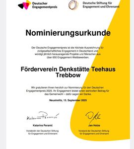 Unser Förderverein Denkstätte Teehaus Trebbow wurde für den Publikumspreis im Rahmen des Deutschen Engagementpreises nominiert.