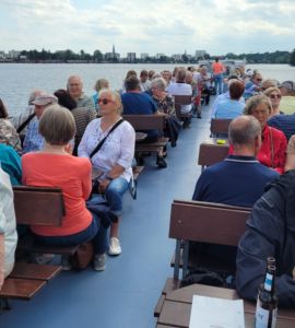 Der Seniorenbeirat organisierte am 20. Juni eine Dampferfahrt auf dem Schweriner See. Bei Sonnenschein und guter Laune gingen 32 Teilnehmer an Board, wo schon eine schön gedeckte Kaffeetafel auf sie wartete. Pünktlich ging die Fahrt los in Richtung Stangengraben, Heidensee, Ziegel- und Außensee und dann zurück zum Schloss. Begleitet wurde die Fahrt durch die Information des Kapitäns über Flora, Fauna und Sehenswürdigkeiten von Schwerin. Der Schweriner See ist ein richtiges Kleinod und dient zur Erholung der Schwerin und Besucher. In gemütlicher Runde verbrachten die Senioren die Fahrt auf dem Ober- oder Unterdeck. Besonders freuten wir uns über neue Gesichter aus der Gemeinde, die unsere gesellige Runde bereicherten. Es war ein rundum gelungener Nachmittag. Herzlichen Dank an Danilo Saß, der unsere ältesten Senioren in altbekannter Weise gefahren hat.